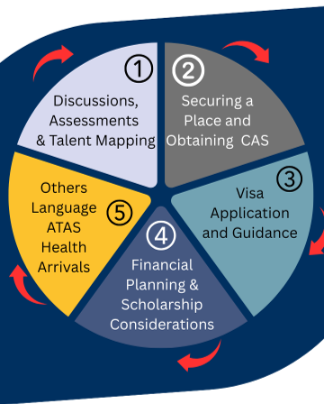 These stages are assessment, discussions, talent mapping, college or university selection, application, visa procedures guidance, departure- arrival support, and lastly strategic career development.